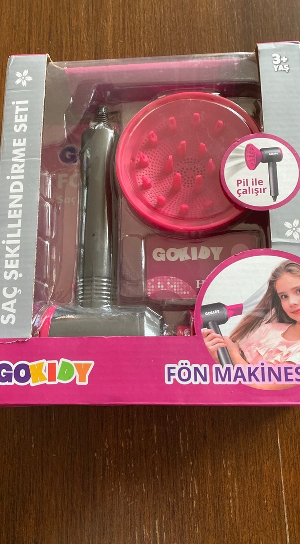 Pembe saç kurutma makinesi ve şekillendirme aparatı içeren set, pil ile çalışır. İki tane hediye geldiği için biri satışta sıfır ürün