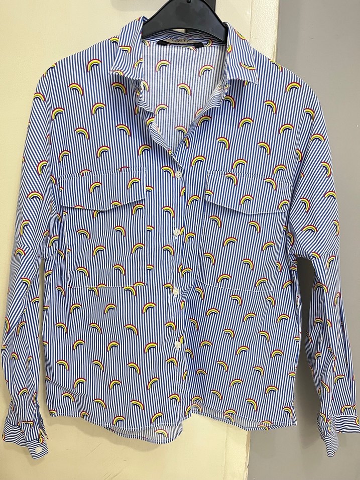 Uzun kollu, düğmeli ve yakalı bu kadın gömleği, hafif çizgili zemin üzerinde renkli gökkuşağı desenleri içerir. Rahat kesimli ve yumuşak dokulu kumaştandır.