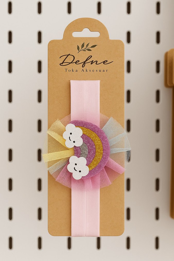 Pembe pastel renkte, gökkuşağı baskılı kurdele ve bulut detaylı bohem tarzda kız çocuk saç bandı.