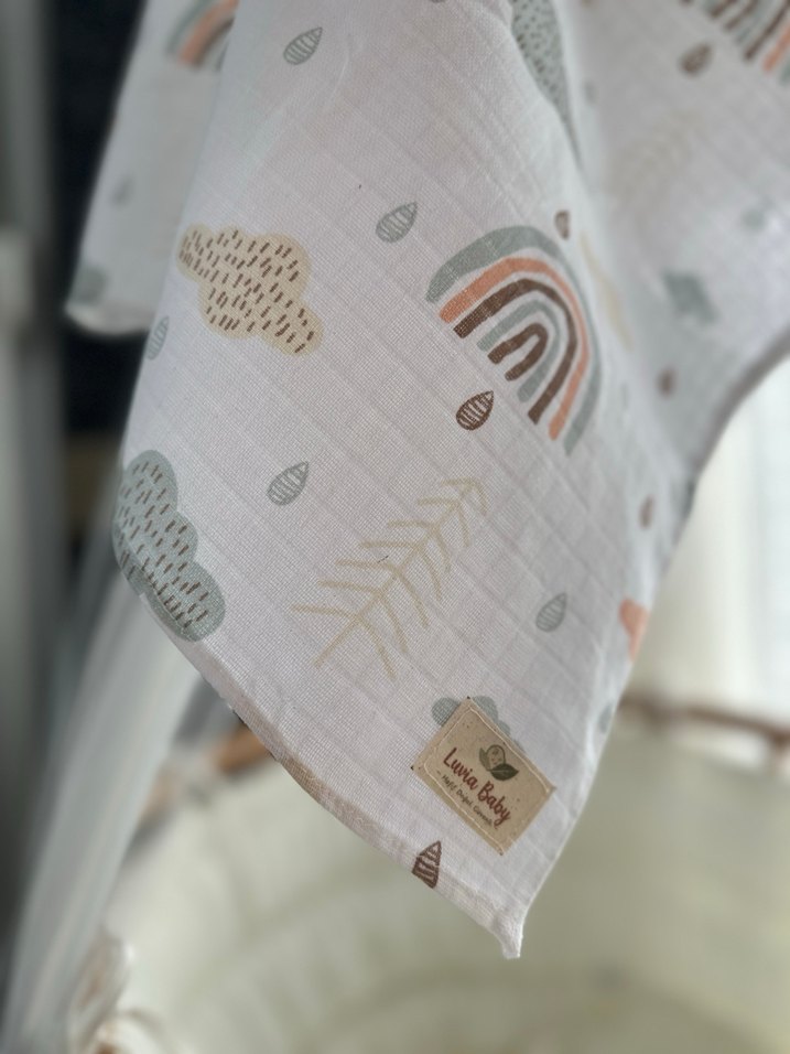 Yumuşak %100 pamuk müslinden yapılmış, gökkuşağı ve bulut desenli Müslin örtü.