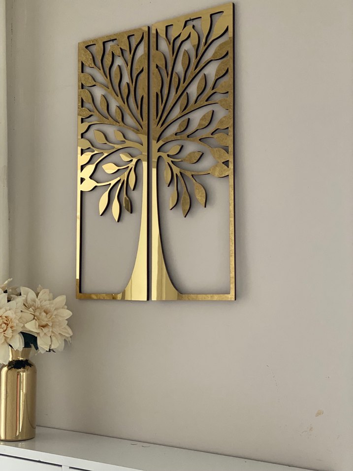 Parlak altın renkli, ağaç şeklinde tablo ve duvar dekoru, çok severek kullanıyordum ama oraya ayna yaptırmaya karar verdiğim işim satıyorum hiç Bir sıkıntısı kırığı çiziği yoktur