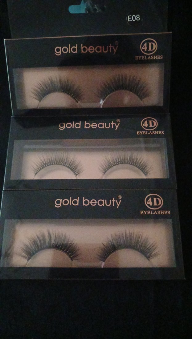 Gold Beauty markasına ait E08 model 4D sahte kirpikler, koyu altın rengindedir ve doğal hacim sağlar. ✨