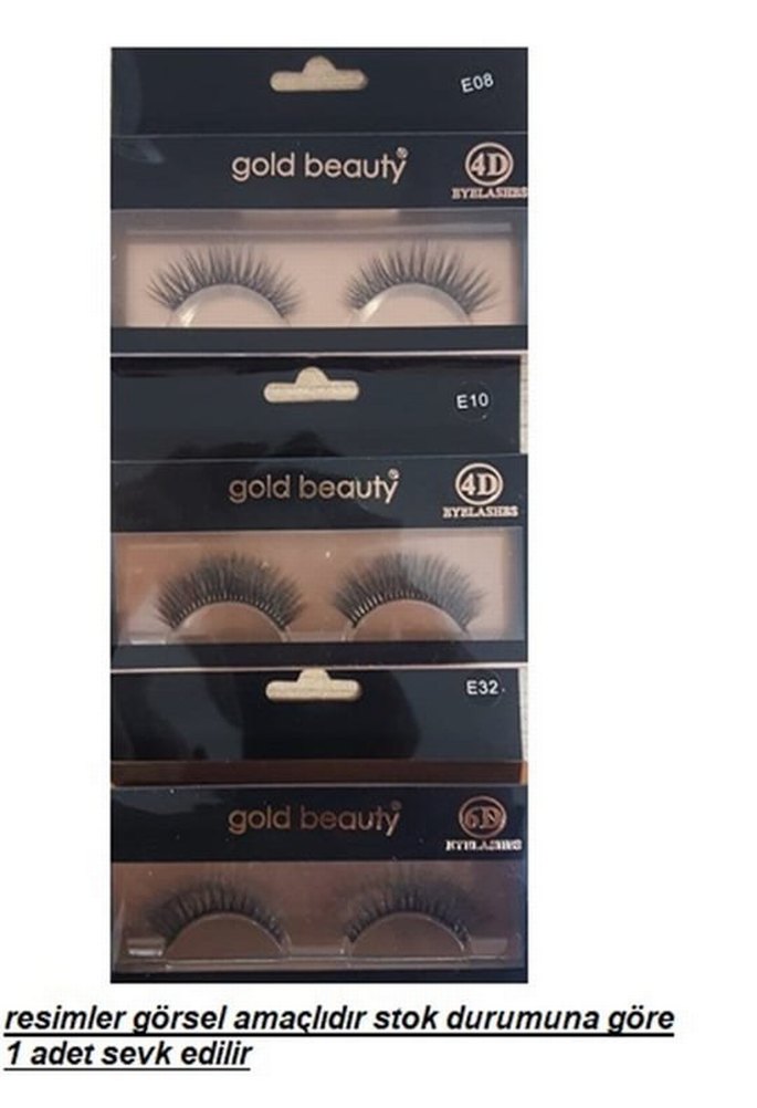 Gold Beauty markasına ait 6D parlak altın renkli takma kirpikler, E08, E10 ve E32 modellerinde mevcuttur. Her pakette 1 çift bulunur. ✨