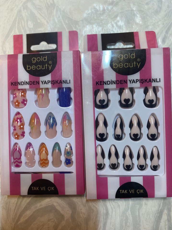 Gold Beauty çok renkli, kendinden yapışkanlı tırnak süsleri, hafif canlı desenlere sahip. Tak ve çıkar kolaylığı sunar. 1 kere kullanıldı ikili fiyattır