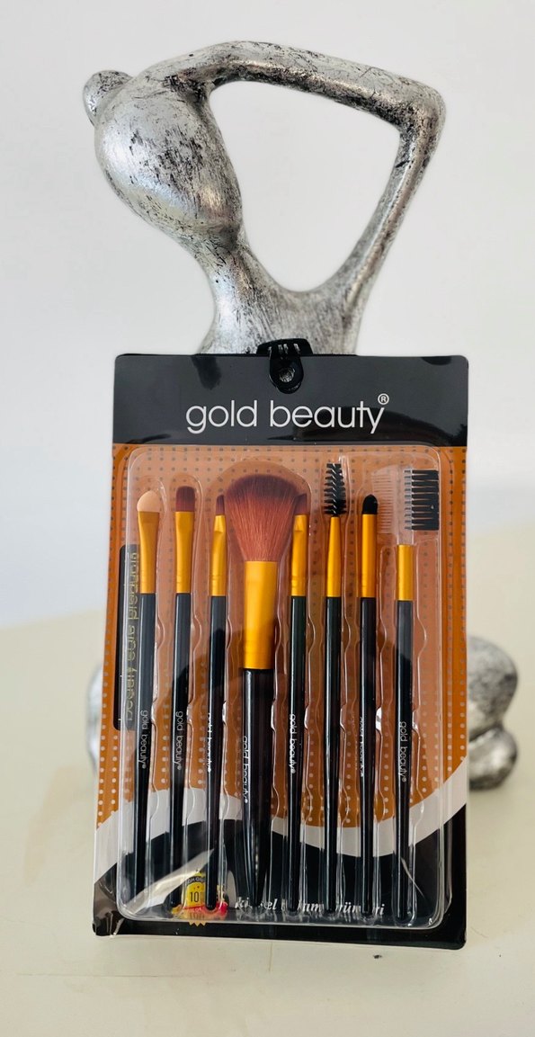 Gold Beauty makyaj fırça seti, detaylı uygulama için koyu saplı ve altın renkli fırçalar içerir. ✨