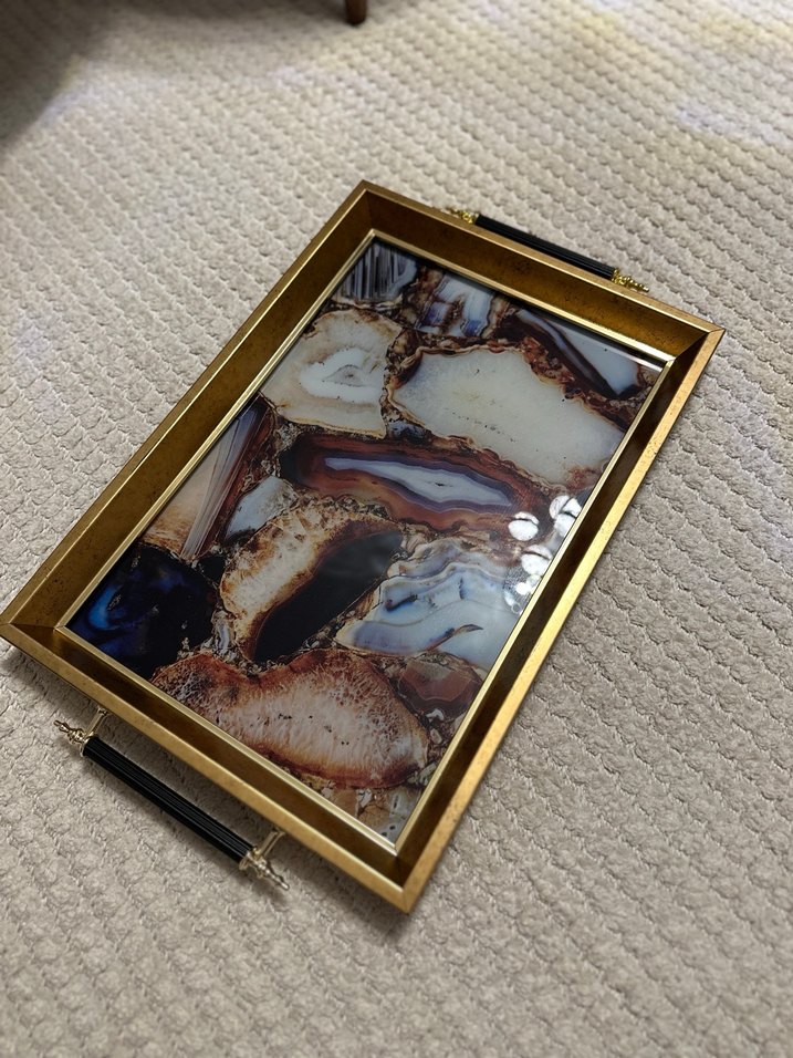 Alt kısmında koyu doğal taş desenleri ve kolay taşınması için siyah sapları olan altın çerçeveli dekoratif tepsi. Ölçüleri: 31 - 43 cm