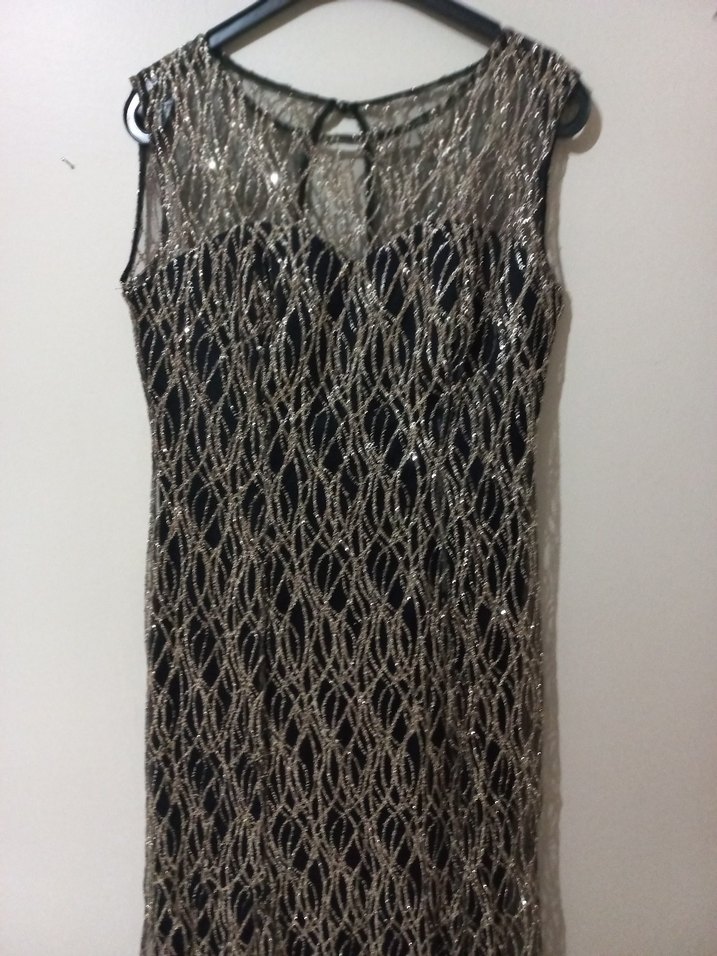 Kolsuz, dantel detaylı ve yılan desenli uzun abiye elbise. V yaka ve vücuda oturan kesimiyle partiler için şık ve göz alıcıdır. Gold renktedir. sadece 1 kere giyildi. 4 beden.