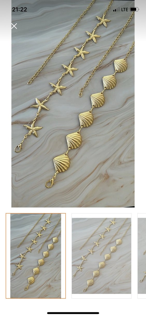Deniz yıldızı ve deniz kabuğu detaylı, altın renkli el zincirleri. Parlak yüzeyiyle bohem ve minimal tarzı yansıtır, plajda kullanıma uygundur.