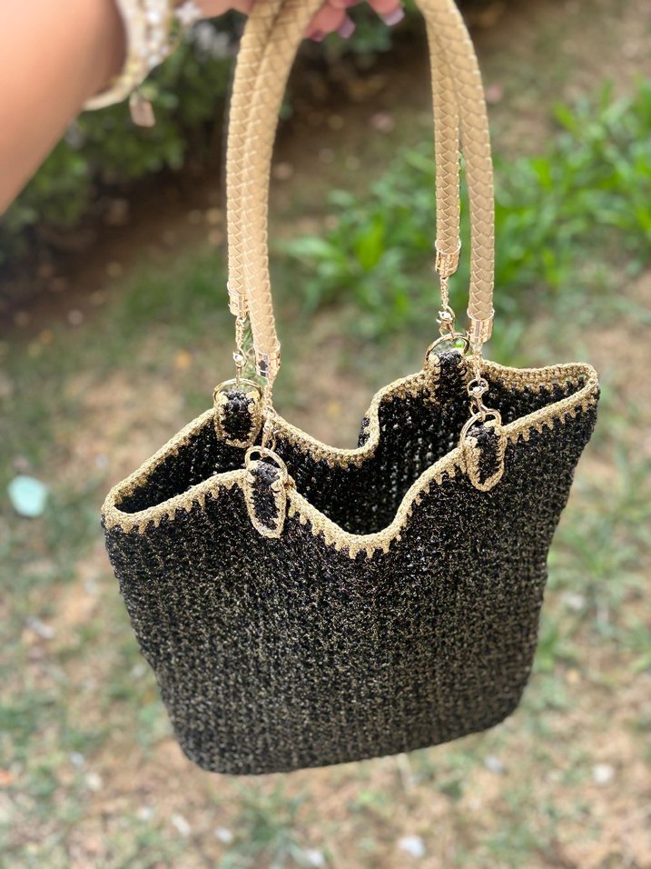 Ürün yeni etiketli tek model olarak tasarlanmıştır..Él örgüsü simli makrome ip, gold deri taban ve saplarla detaylandırılmış ister plaj ister günlük kullanıma uygun büyük boy askılı kol çantası