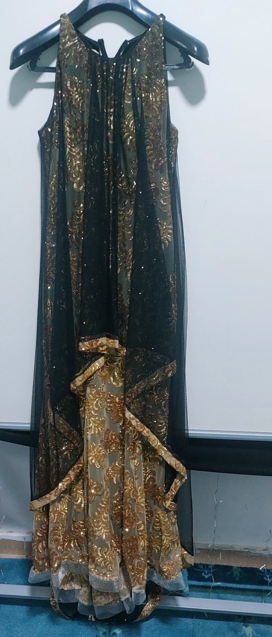 Straplez, drapeli ve desenli altın renkli uzun abiye elbise, salaş kesimiyle düğünler için uygun ve kolsuzdur.