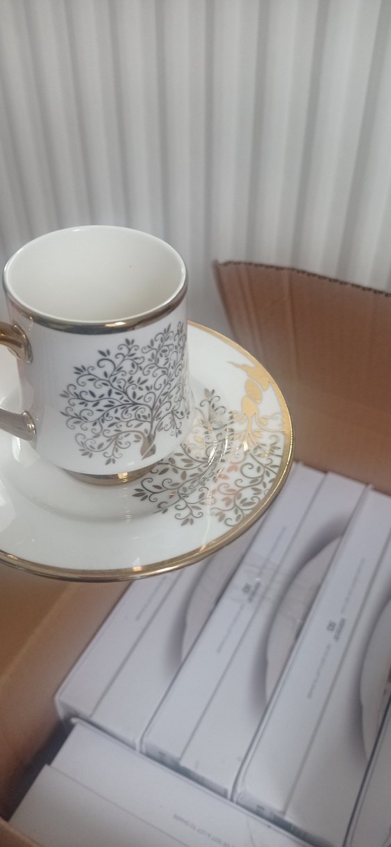 Gold ağaç desenli beyaz kahve fincanı ve tabağı, altın detaylarla şık bir sunum sağlar. ☕