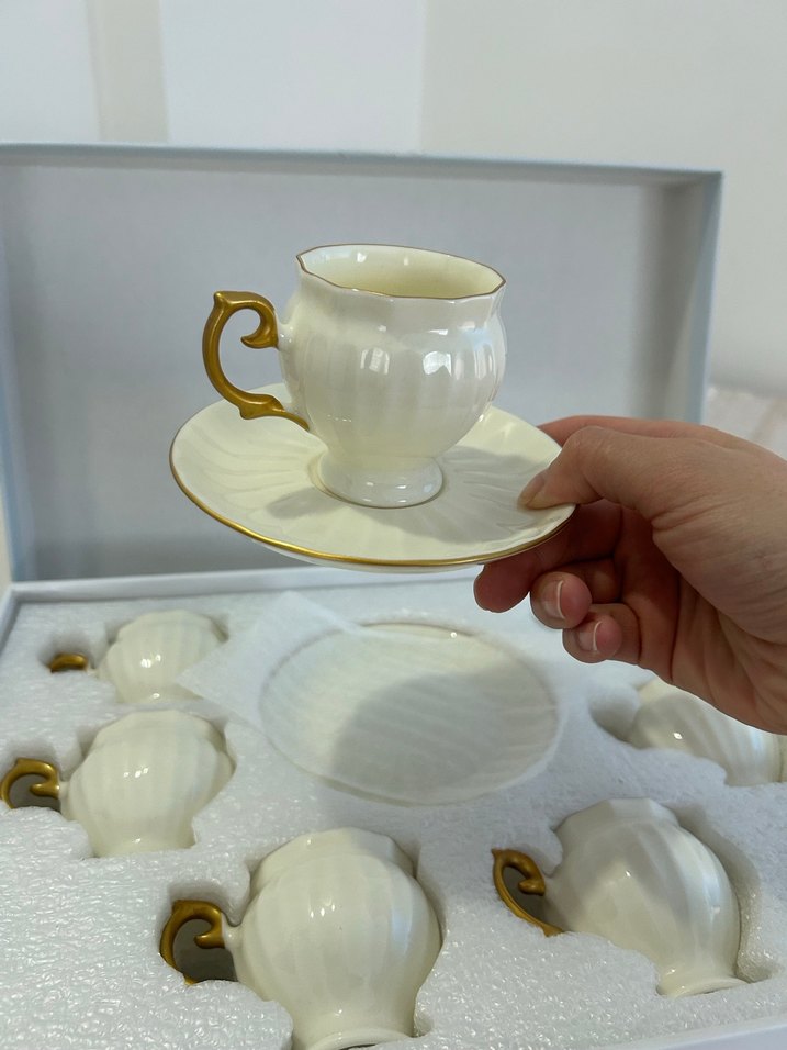 Gold sap ve kenar detaylı beyaz porselen fincan takımı, pastel tonlarda şık tasarım. Yanında uyumlu tabağı ile klasik görünüme sahip. 6 kişilik kutulu şekilde duruyor hiç kullanılmadı. ☕