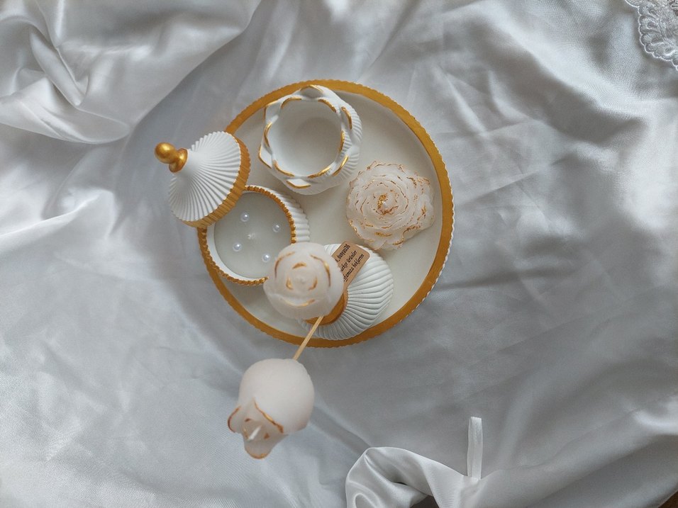 Altın detaylı beyaz mum ve mumluk seti, mekâna yumuşak bir ışık katmak için uygundur. ️ tüm set dahildir