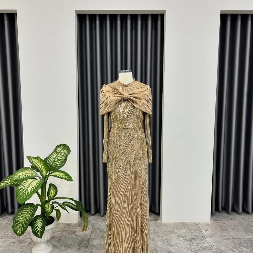 gold renkli, drapeli tasarıma sahip uzun kollu abiye elbise. Tek renk ve parlak yüzeyiyle düğün ve özel günler için uygundur. ✨ abiye kiralıktır toplu kiralamada fiyatta yardımcı oluyorum satılık 3500tl