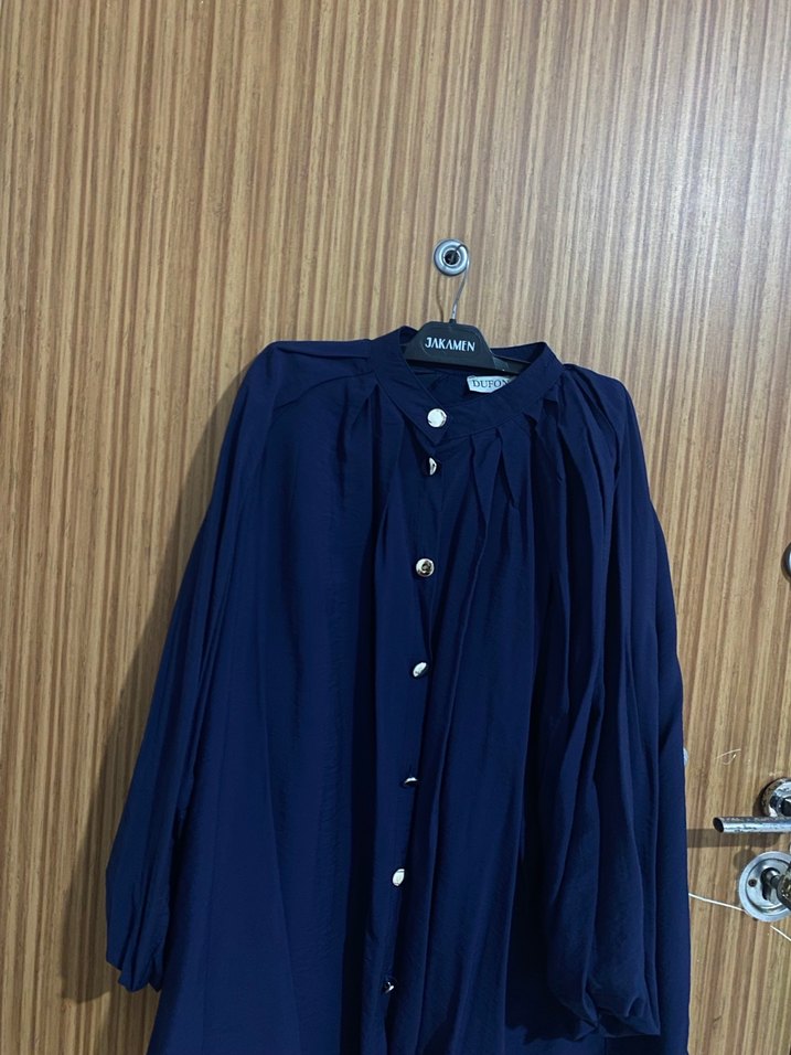 Gold Düğmeli, uzun kollu ve yakalı bu kadın gömleği, yumuşak keten kumaştan koyu lacivert renkte. Salaş kesim ve uzun boyuyla minimal ve normcore stiline uygun, günlük kullanıma elverişli belden bağlamalı ipi vardır