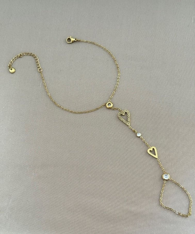 Altın renk zincir detayları ve kalp figürlü kadın el zinciri, minimal ve bohem tarz için uygun. Günlük kullanıma uygun. ✨