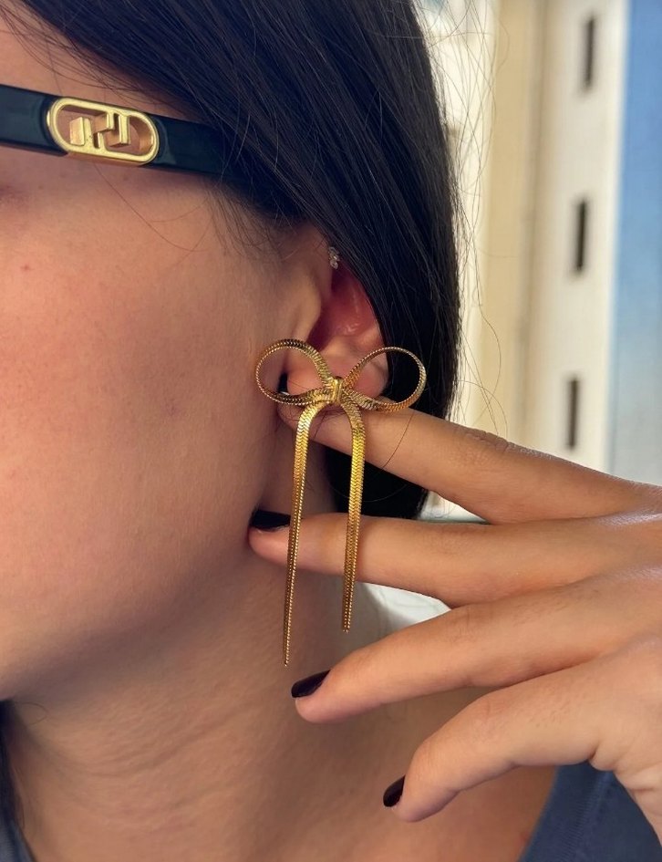 Parlak altın renkli, fiyonk şeklinde midi küpeler. Desenli tasarımıyla parti ve sokak modasına uygun klasik Paris tarzı. Sadece 1 kere kullanıldı.