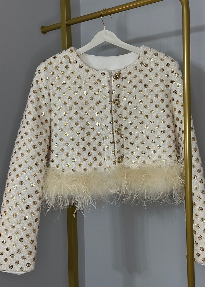 Gold ithal otriş detaylı tüylü pullu ceket