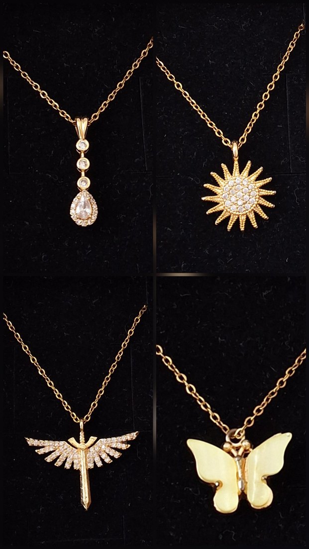 İsteğe göre 33cm gold zinciriyle beraber de gönderim yapılabilir. Kelebekli kolye ucu hariç diğerlerinin kararması, solması veya taşlarının eksik olması gibi kusurları yoktur. Hepsinin toplu fiyatı 100TL dir. Aralarından beğendiğiniz olursa tekli alım da yapabilirsiniz. Tekli fiyatları; - Güneş Kolye Ucu 30 TL - Kanatlı Kılıç Kolye Ucu 30 TL - Damla Kolye Ucu 30 TL - Kelebek Kolye Ucu 20TL - Gold Kolye Zinciri 50 TL