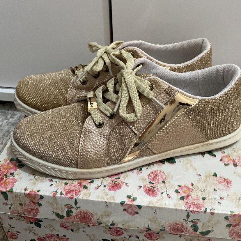 Gold renkli, sayılı kullanılmış tertemiz 37-37,5 uygun kadın sneaker. Günlük sokak stili için uygundur.