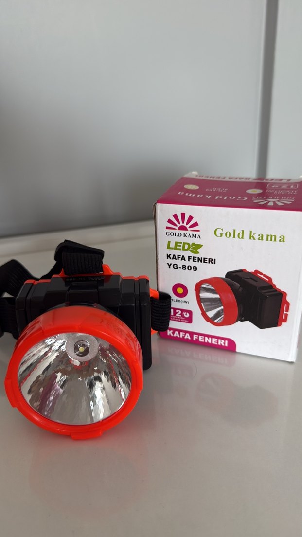 Gold Kama LED Kafa Feneri YG-809, renkli tasarıma ve parlak altın reflektöre sahiptir. 12 saat ışık verir, ayarlanabilir bantlıdır.