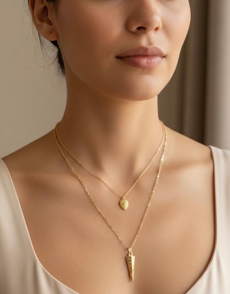 Minimalist ve çağdaş tasarıma sahip, kısa uzunlukta altın renkli zincir detaylı kadın kolye, romantik akşamlar için uygundur.