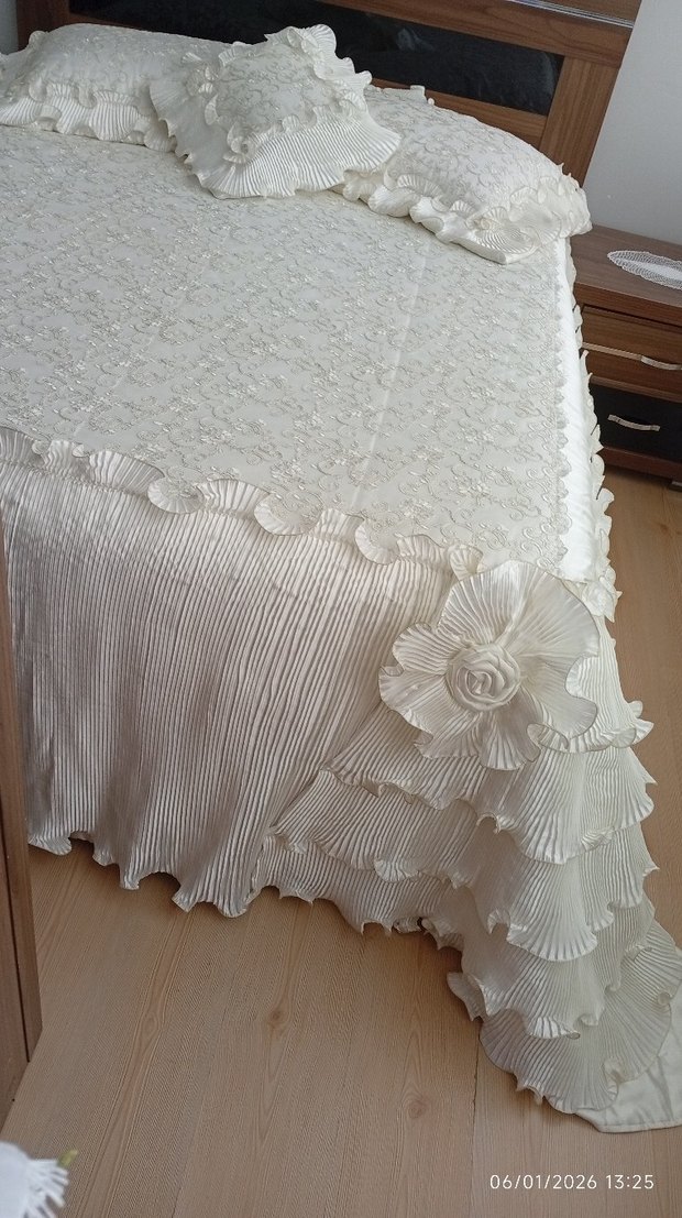 Gold Krem renkte, işlemeli detaylara vel fırfırlı kenarlara sahip yatak örtüsü. Yumuşak ve zarif dokuda.Tam orantida Kabartmalı şık ve çeyize konacak kadar yeni diyebilirim kutusu ile birlikte sıfır ayarında.