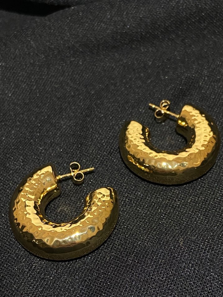 Parlak altın renkli, kısa ve mini halka küpeler. Kabartmalı, tokalı tasarımıyla romantik akşamlar için bohem ve göz alıcı bir dokunuş sağlar.