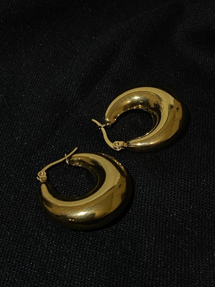 Parlak altın renkli, kabartmalı halka küpeler. Minimalist ve günlük kullanıma uygun, sokak stiliyle uyumlu.
