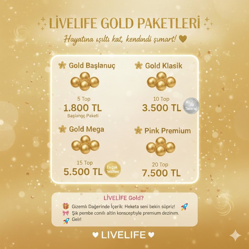 Gold Mega paketi 15 adet içerir ve fiyatı 5.500 TL'dir. Şık pembe ve altın konseptli premium tasarıma sahiptir, gizemli içerik sürprizi sunar. ✨
