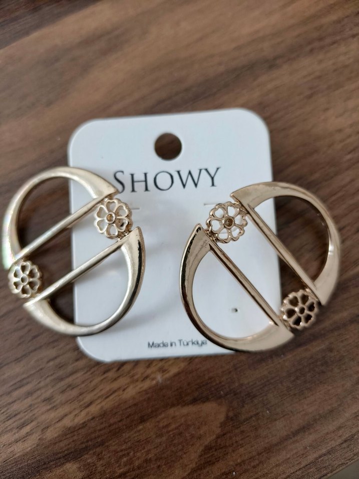 Gold mini tokalı kadın küpeleri, çiçek detaylı ve parlak yüzeye sahip. SHOWY tarafından Türkiye'de üretilmiştir, düğünler için uygundur.