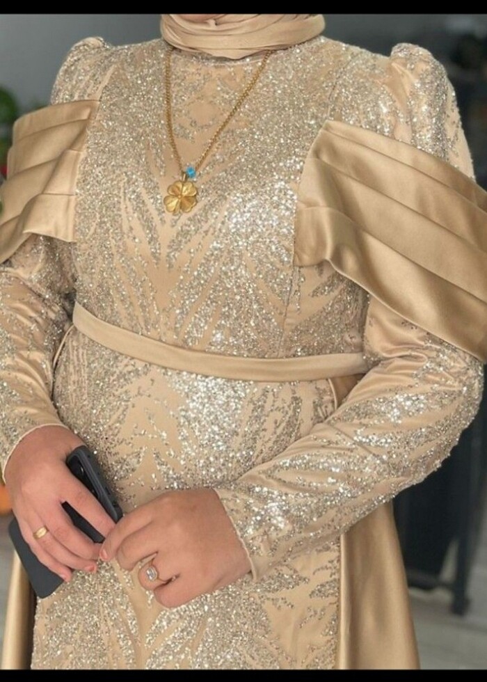 yalnız 2 defa giydim. Gold rengindedir arkası ipli olduğundan 58 bedene kadar olur. 44 46 beden uyumludur.kumasi saten, Kuyruklu abiyedir temiz kullanılmıştır şalı metrelik janjandir yanında hediye olarak vereceğim.