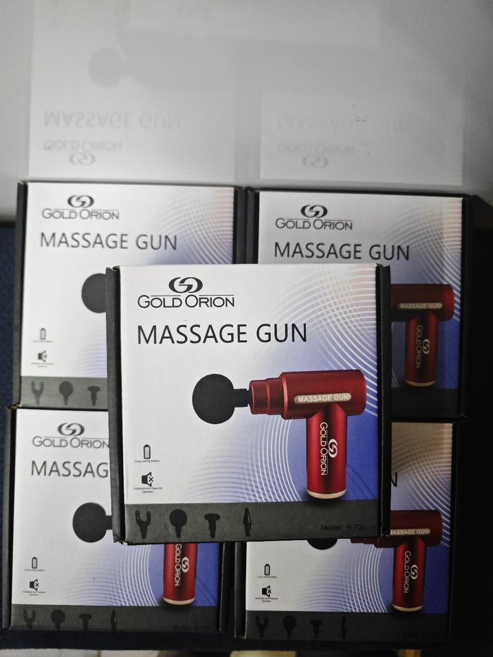 Gold Orion masaj tabancası, koyu altın renginde, farklı masaj ihtiyaçları için çeşitli başlıklarla etkili kas rahatlaması sağlar. 4 Başlıklı Masaj Tabancası TEK fiyat