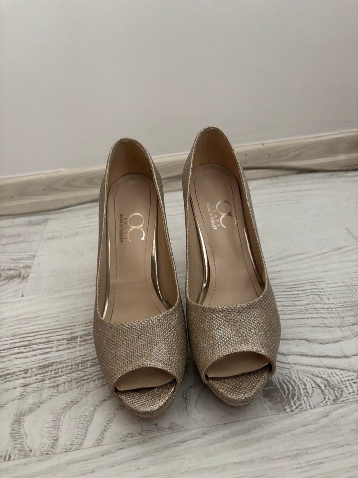 Gold renkli parlak yılan desenli, pileli detaylı platform topuklu ayakkabılar. Düğün ve özel günler için uygundur. Kauçuk tabanlıdır.