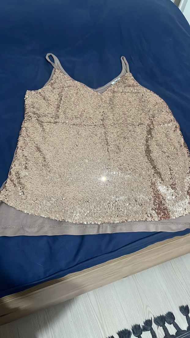 gold renkte, askılı, payetlerle süslenmiş kadın bluz. bol kesimdir. Sentetik kumaştan üretilmiş, parti ve günlük şıklık için uygundur. ✨