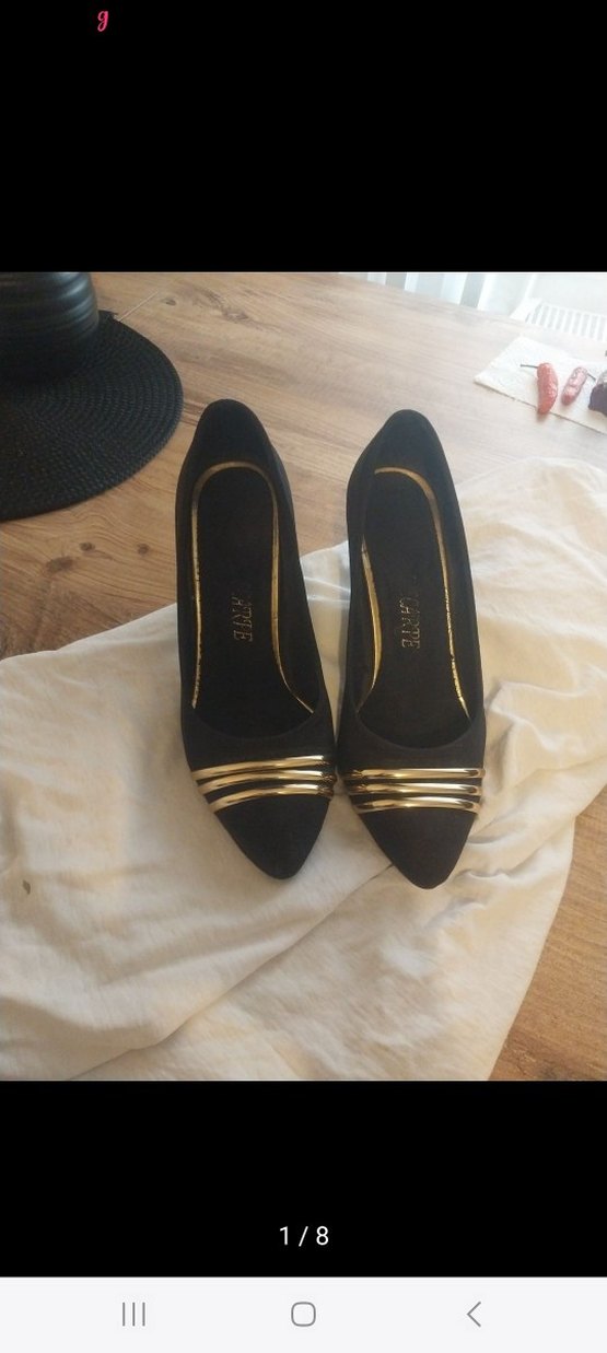 Siyah kadın topuklu stilettolar, gold rengi tokalı detaylarla. Kauçuk malzemeden, gotik stil ve klasik zarafeti birleştirir, ofis için uygun.