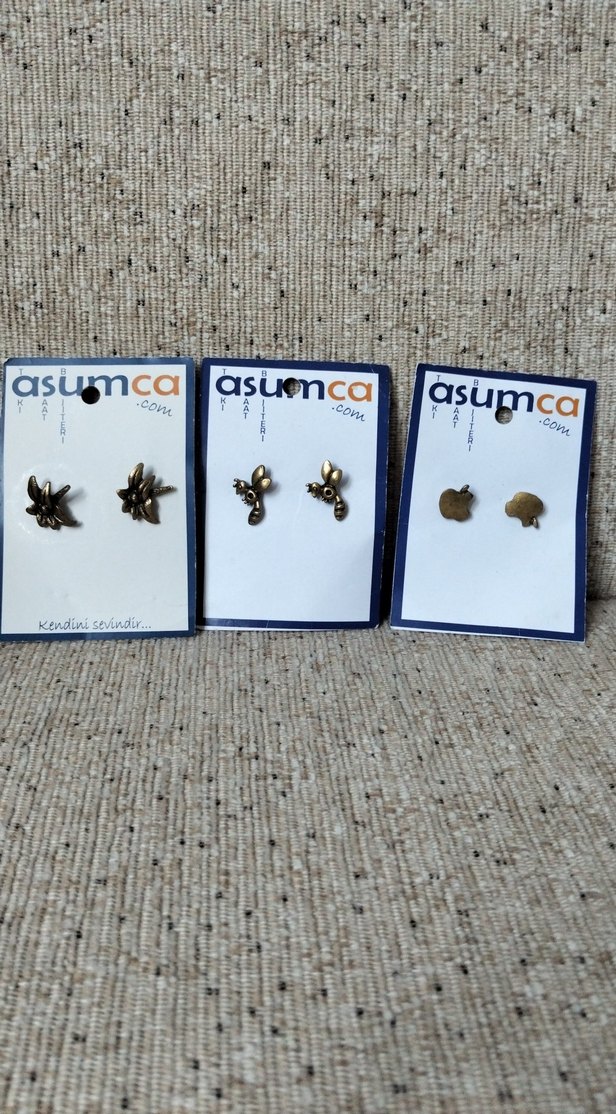 Koyu altın renkli, bohem ve minimalist küpeleri. Çiçek ve soyut şekillerde, Asumca markasına ait.