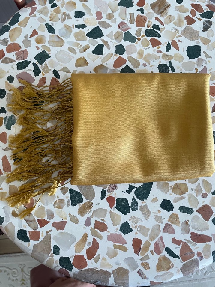 Püsküllü detaylara ve parlak yüzeye sahip, ipek dokulu altın renk kadın şalı. Birkaç kez kullanıldı üzerinde bazı lekeler var.