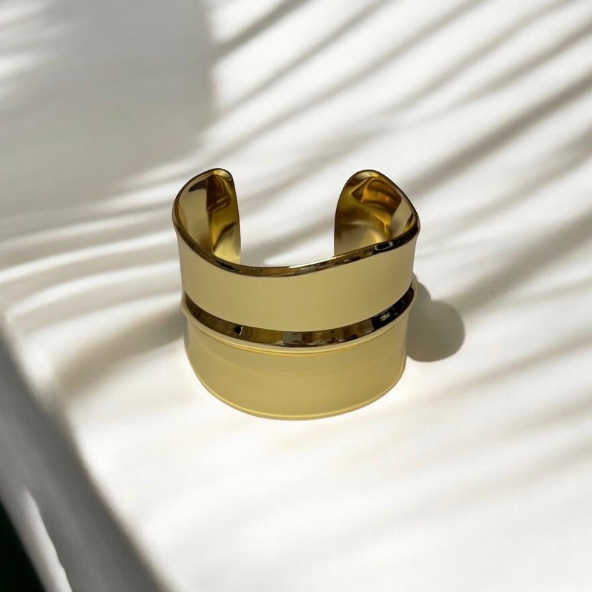 Parlak altın renkli, şık ve desensiz modern tasarımlı kadın bileklik, klasik zarafeti günlük kullanıma sunar. ✨