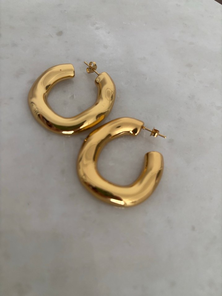 Gold renk, kalın formda halka çelik küpe. Pürüzsüz ve parlak yüzeyiyle modern ve güçlü bir duruş sunar. Paslanmaz çelikten üretilmiştir; kararmaz ve günlük kullanıma uygundur. Minimal ama iddialı tasarımı sayesinde hem günlük kombinlerde hem de şık akşam stillerinde rahatlıkla tercih edilebilir. Tek başına kullanıldığında dahi dikkat çekici bir modeldir.