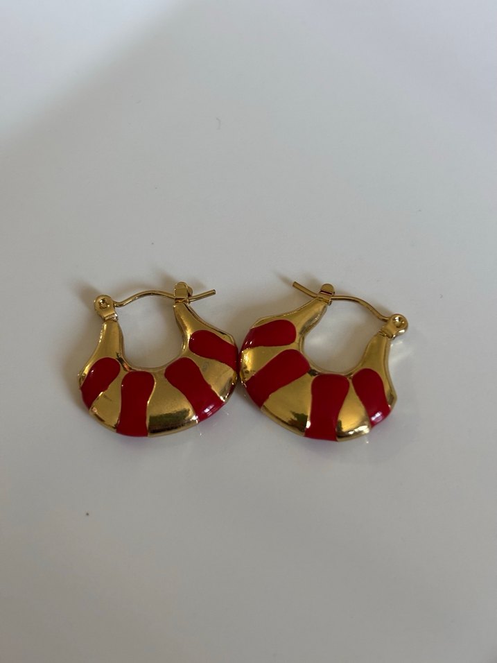 Yeni ve kullanılmamış gold renk çelik halka küpe. Kırmızı renk detayları ile enerjik ve dikkat çekici bir tasarıma sahiptir. Paslanmaz çelikten üretilmiştir; kararmaz ve günlük kullanıma uygundur. Mini halka formu sayesinde modern ve iddialı bir görünüm sunar. Günlük kombinlerde ve özel günlerde rahatlıkla tercih edilebilir.