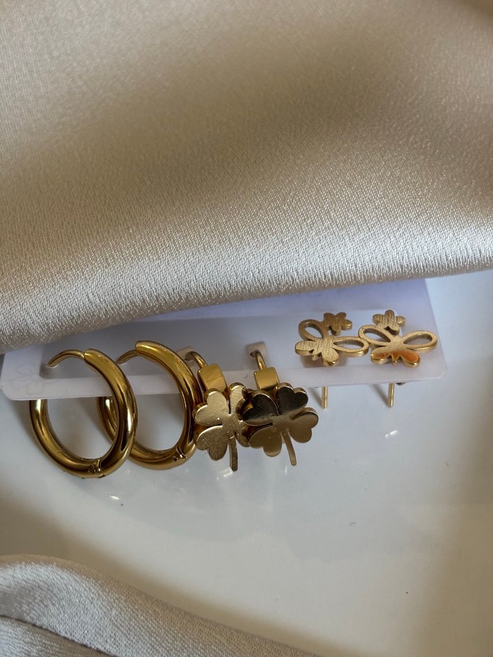 Yeni ve kullanılmamış gold renk çelik küpe seti. Set içerisinde 3 çift küpe bulunmaktadır: • 1 adet gold renk mini halka küpe • 2 adet yonca formlu mini küpe Paslanmaz çelikten üretilmiştir; kararmaz ve günlük kullanıma uygundur. Minimal ve zarif tasarımları sayesinde günlük kombinlerde, ofis kullanımında veya hediye alternatifi olarak ideal bir settir. Hafif yapıları sayesinde kulakta konforlu kullanım sağlar. Not: Set olarak satılmaktadır, tek tek satış yoktur.