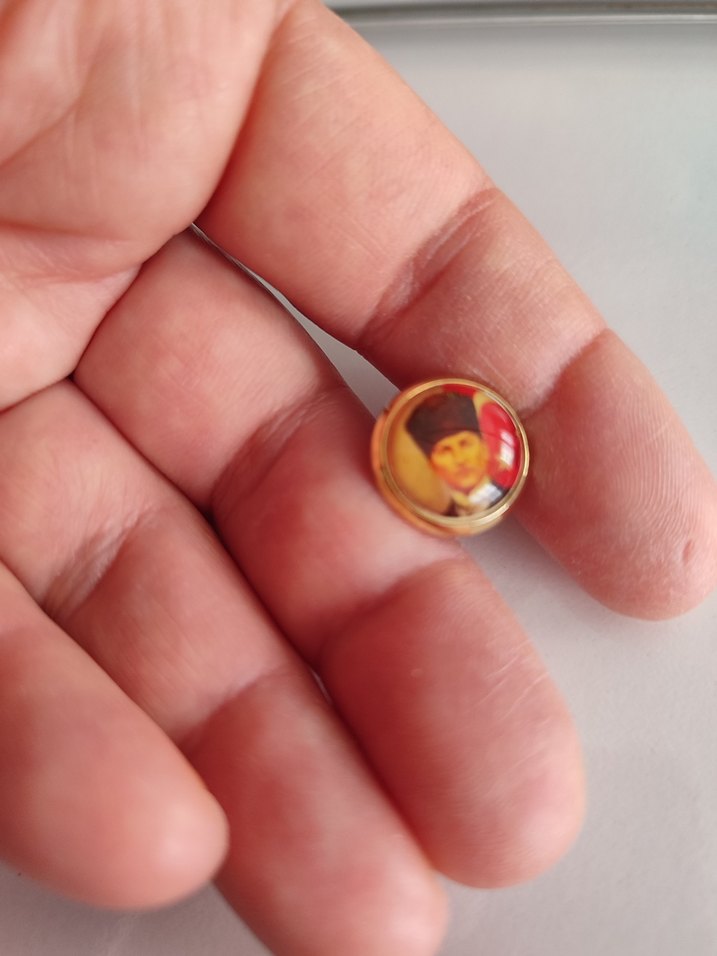 Parlak altın renkli Atatürk rozeti, altın rengi yuvarlak çerçeveli ve Atatürk fotoğraflı yeni ürün