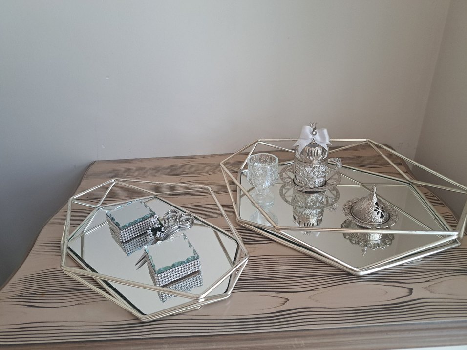Altın renkli, aynalı yüzeye sahip dekoratif tepsi seti, ev dekorasyonunuza şıklık katar. Küçük eşyalar için uygundur.✨