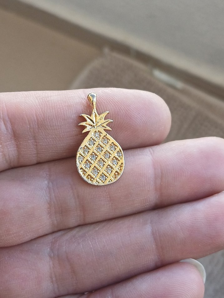Parlak altın renginde, boncuklu ananas deseniyle minimalist ve bohem tarzda, günlük kullanıma uygun kolye ucu.