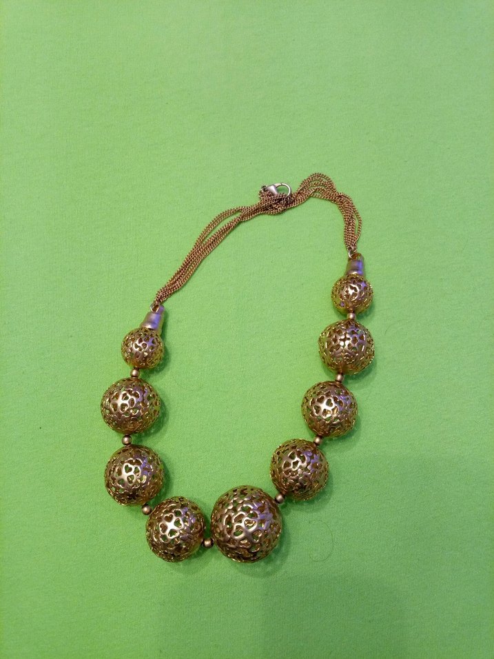 Bu bohem tarz kolye, yılan desenli altın renkli boncuklu kürelerden oluşur. Midi uzunlukta olup günlük kullanıma uygundur.