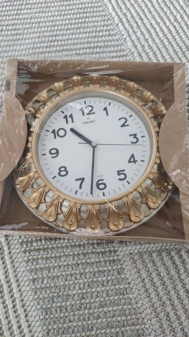 Altın renkli dekoratif çerçeveli duvar saati, beyaz kadran üzerinde siyah rakamlarla saat gösterir. Üç akrep, yelkovan ve saniye ibresi bulunur. ⏰