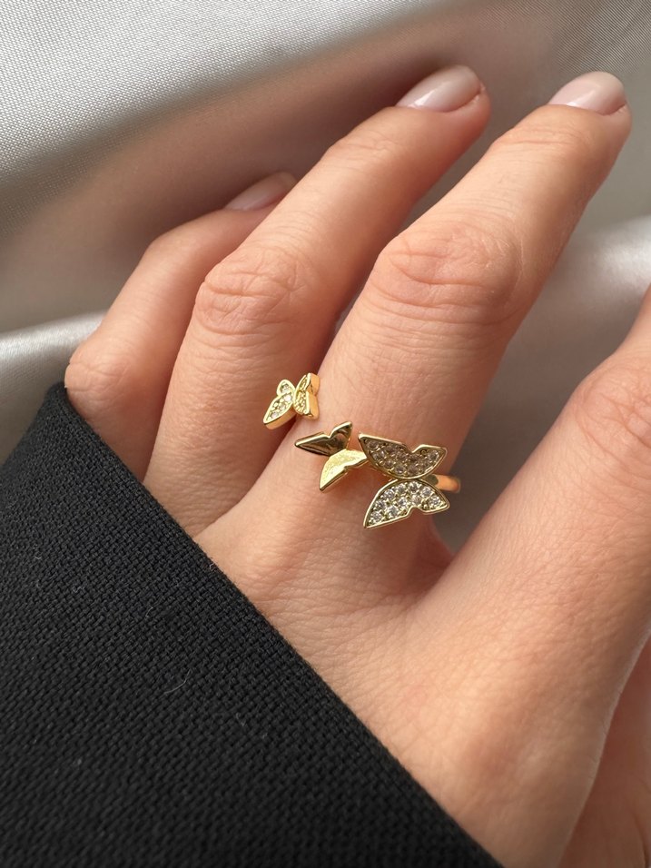 Altın renkli, minimal tasarımlı, simli kelebek detaylı yüzük, romantik akşamlar ve şık kombinler için ideal.