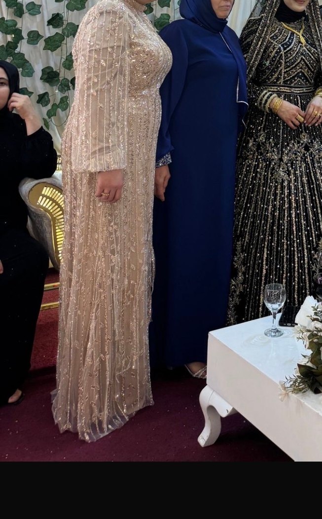 Altın renginde, etnik desenli ve notalı yaka detaylı, uzun kollu, boncuk işlemeli tesettür abiye elbise sadece bir kere giyildi