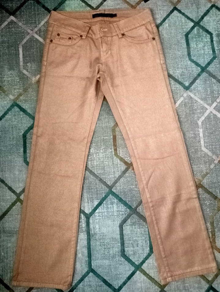 Gold simli pırıltılı, midi uzunlukta, rahat kesim kadın kot pantolon. Yumuşak sentetik kumaştan, pastel tonlarda,kombinlemenize göre hem günlük hem özel günlerde kullanıma uygun.Sadece birkaç kez giyildi,şu an kilo aldığım.icin giyemiyorum.Urun sıfır ayarındadir.Kot pantolon bedenine göre 27 bedendir.